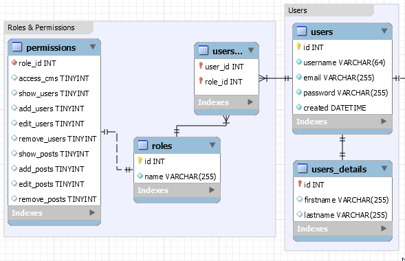 As you can see, I used a 1:n relationship, meaning that 1 user can have n (multiple) roles.